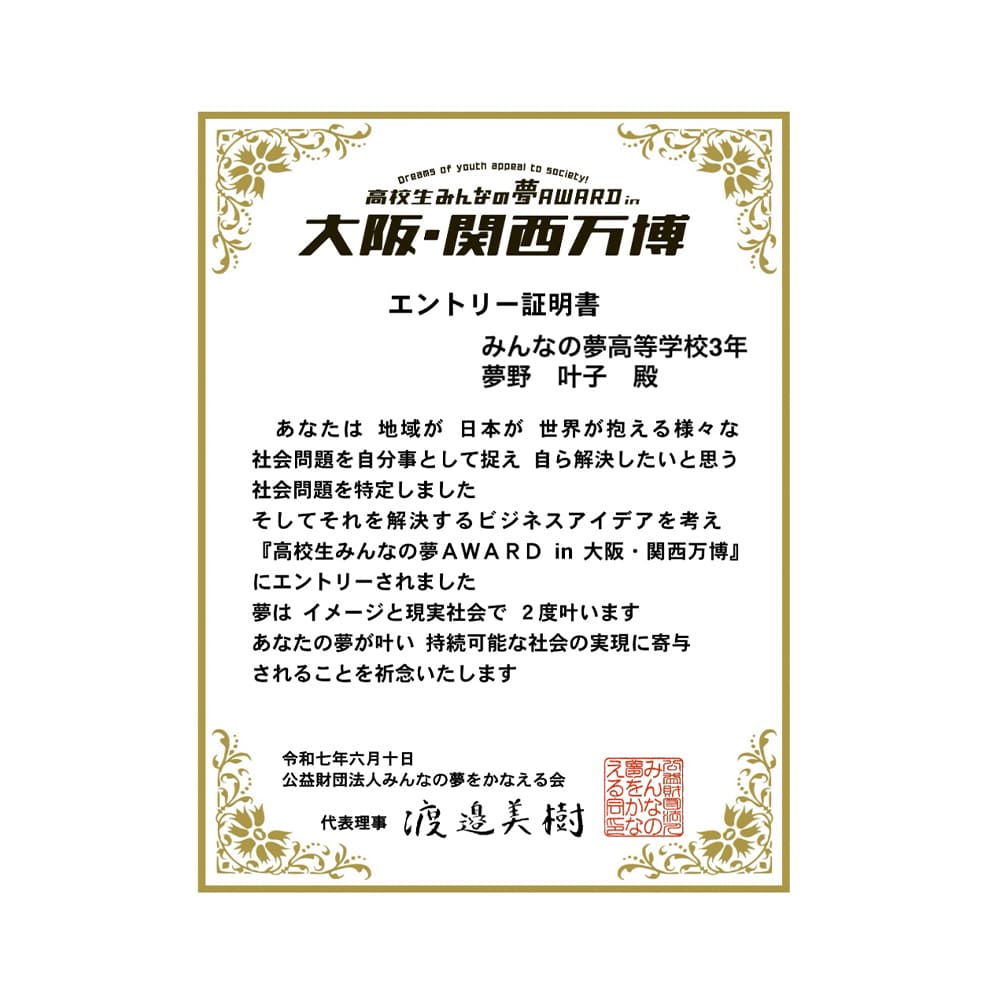 エントリー者全員に高校生みんなの夢AWARD7全国大会エントリー証明書を発行